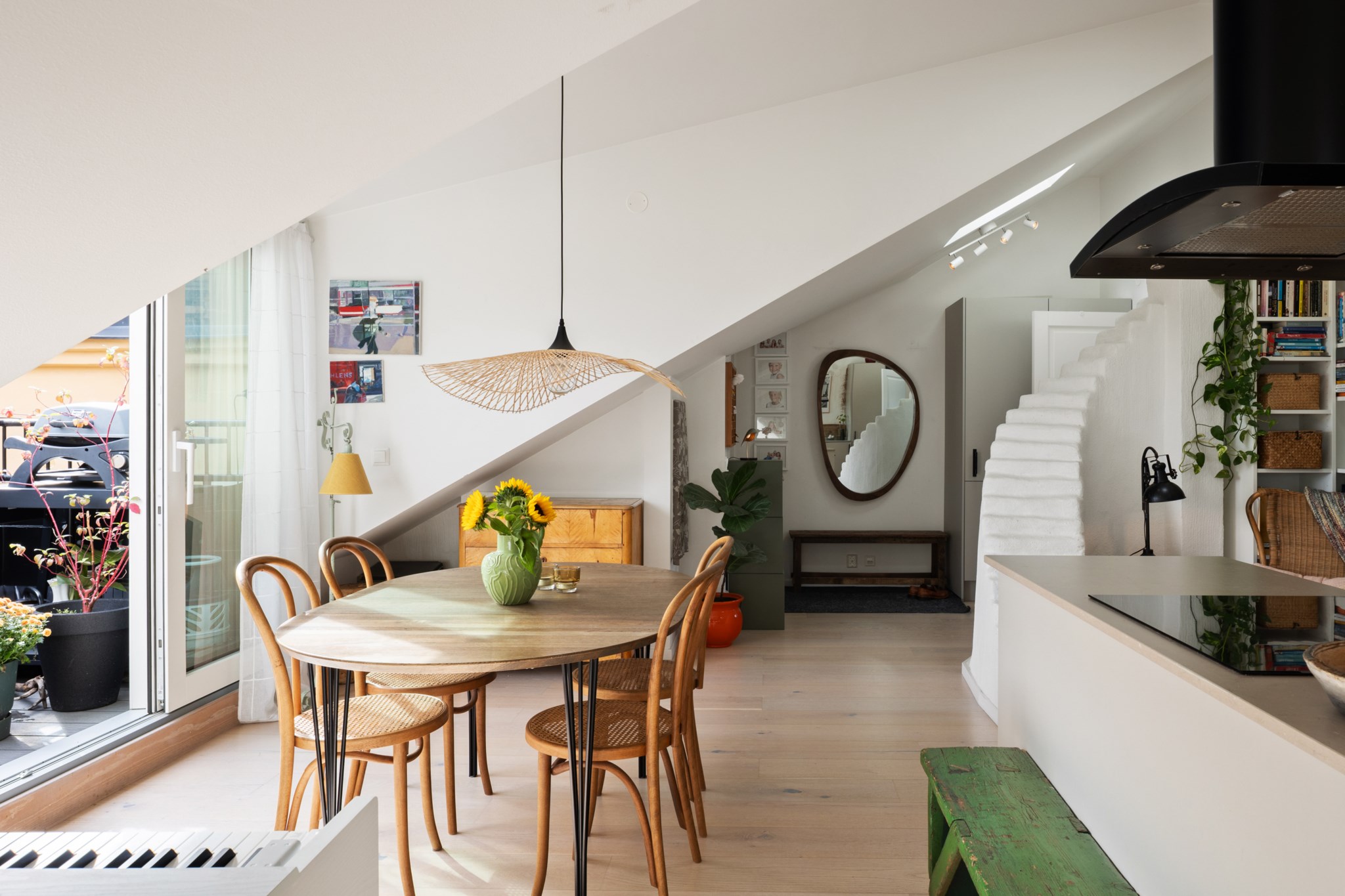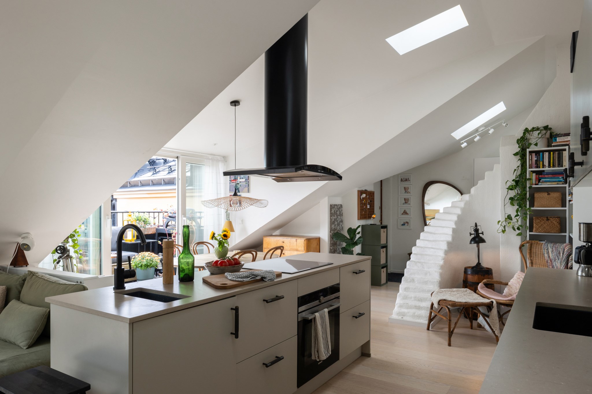 Bostaden bjuder på en exklusiv atmosfär med genomgående ljusa trägolv, vitmålade väggar och unika detaljer som den karaktäristiska änglatrappan.