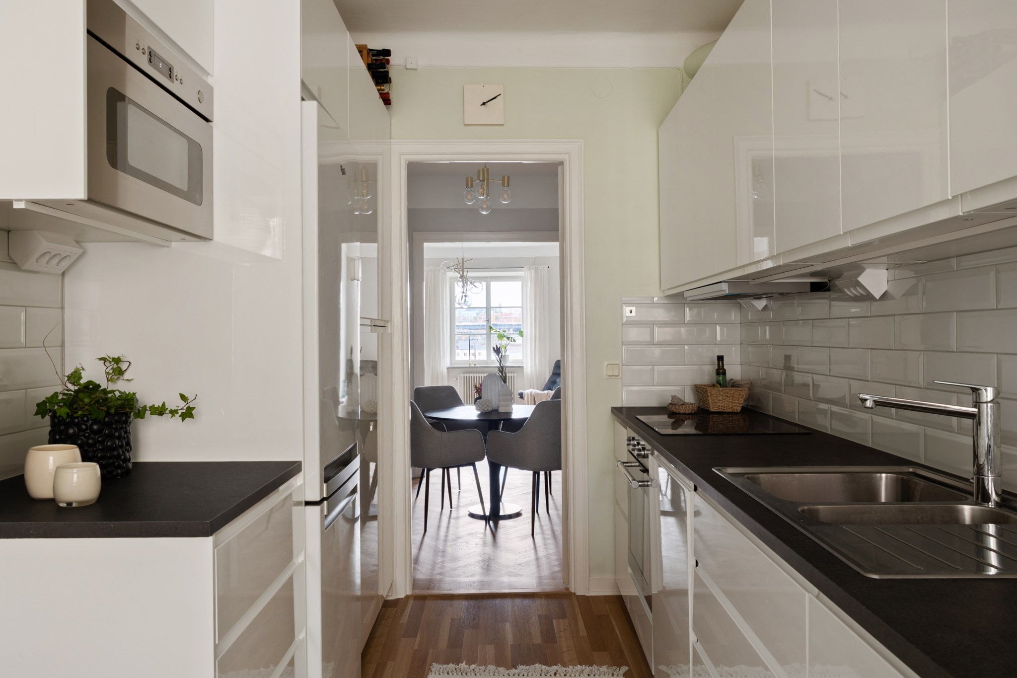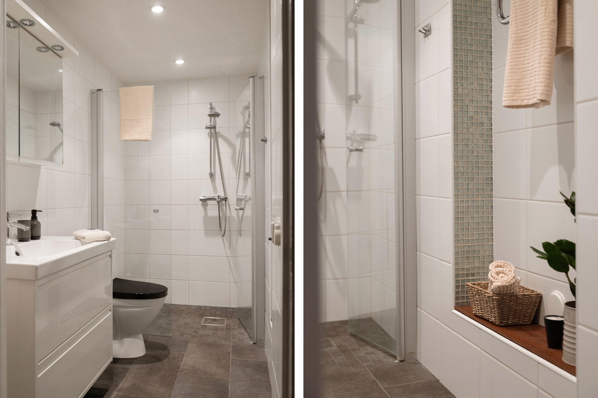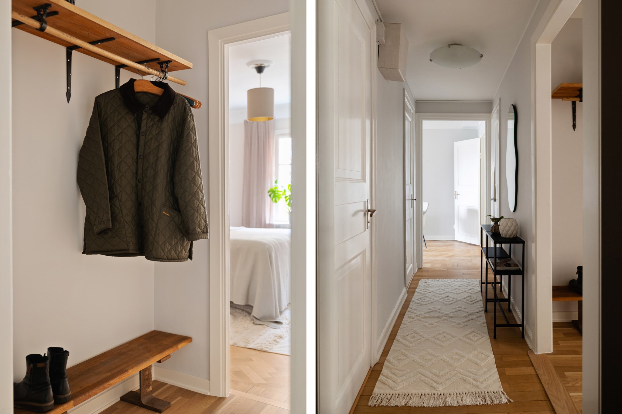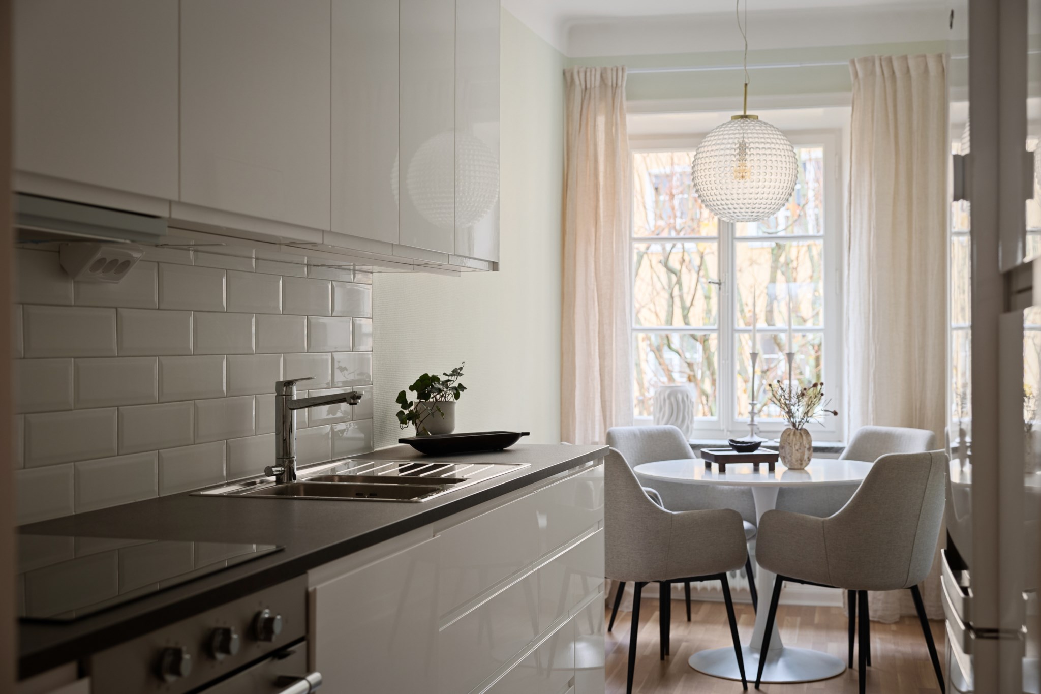 Nuvarande kök är nytt från 2025, stilrent och välutrustat med gott om arbetsyta och förvaring. Båda sovrummen vetter mot den lummiga, rofyllda innergården: det större rummet erbjuder gott om plats för dubbelsäng och förvaring, medan det mindre passar perfekt som barnrum, gästrum eller hemmakontor och har dessutom utgång till en egen balkong. Hallpartiet välkomnar med god avhängning och sammanhållen förvaring, och badrummet är funktionellt och trivsamt i en stil som harmonierar med resten av hemmet.