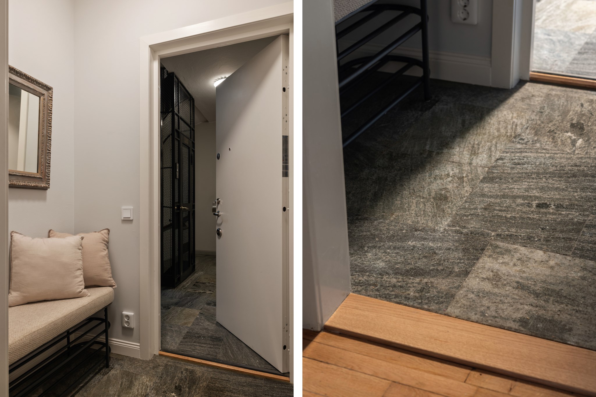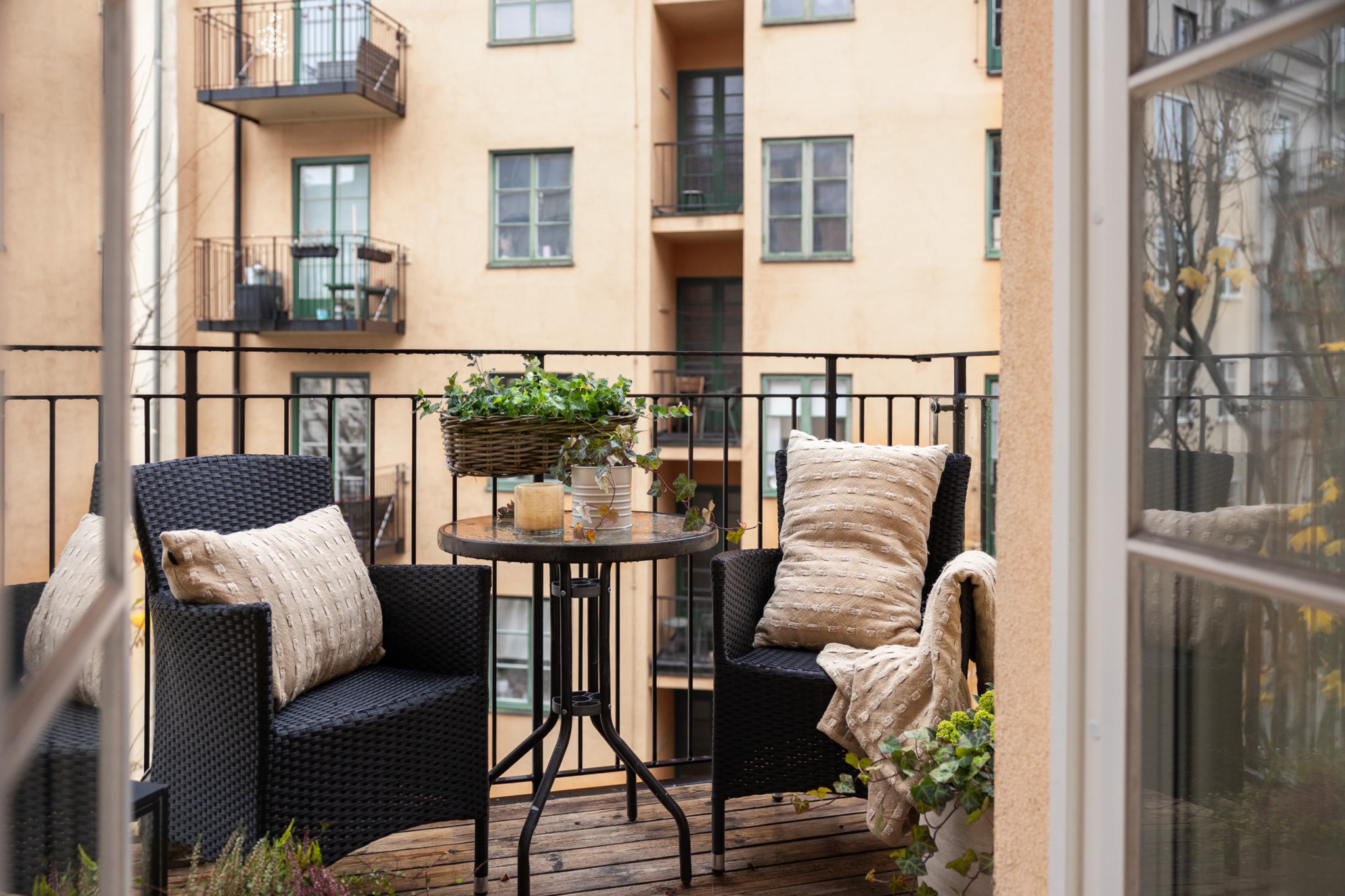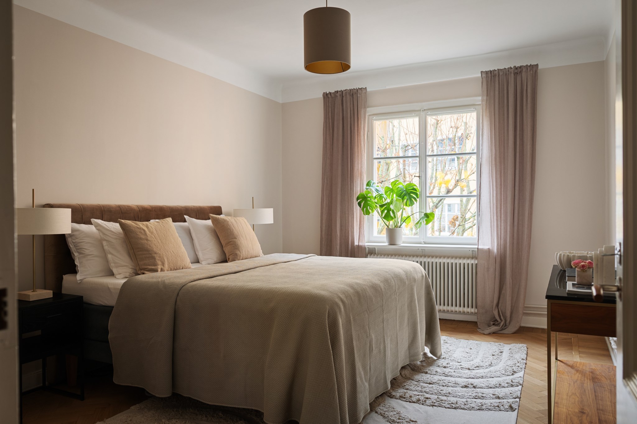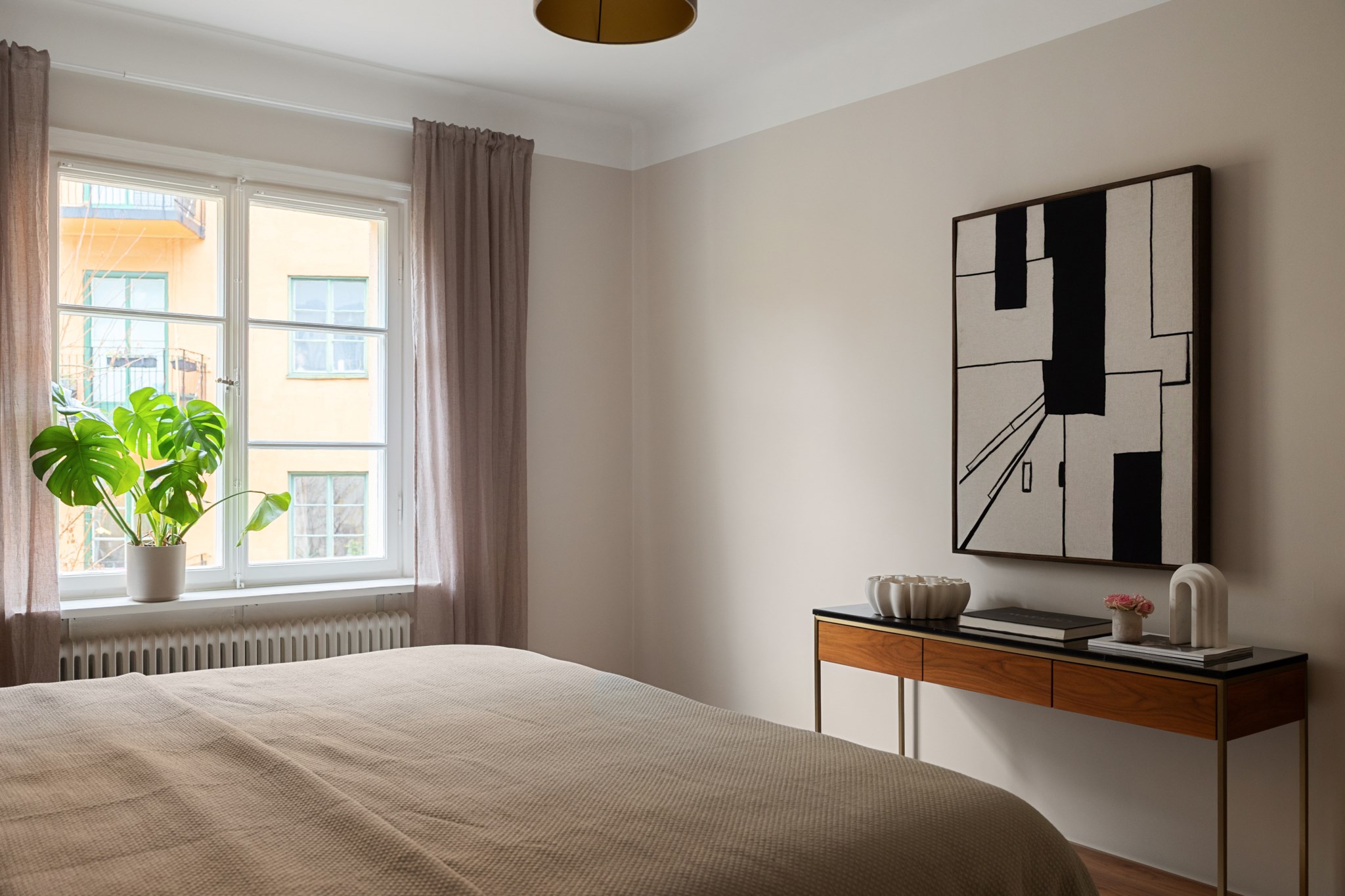 Nuvarande kök är nytt från 2025, stilrent och välutrustat med gott om arbetsyta och förvaring. Båda sovrummen vetter mot den lummiga, rofyllda innergården: det större rummet erbjuder gott om plats för dubbelsäng och förvaring, medan det mindre passar perfekt som barnrum, gästrum eller hemmakontor och har dessutom utgång till en egen balkong. Hallpartiet välkomnar med god avhängning och sammanhållen förvaring, och badrummet är funktionellt och trivsamt i en stil som harmonierar med resten av hemmet.